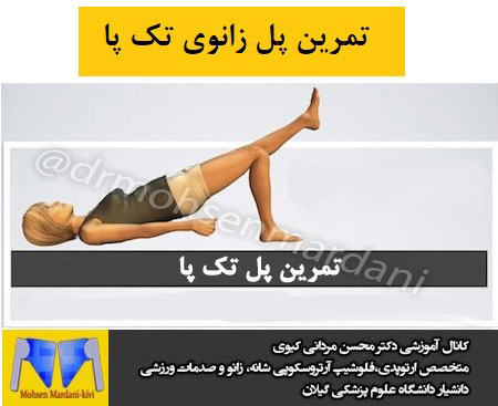 در حالی که زانوها را خم و کف پاها را صاف روی زمین قرار دادهاید، پاشنه خود را از زمین فاصله دهید. باسن خود را به آرامی به سمت بالا ببرید، تا زمانی که یک خط مستقیم میان شانهها تا زانوی شما تشکیل شود. در این موقعیت بمانید و پای راست خود را بکشید. 5 ثانیه آن را نگه دارید. پای راست را بر زمین بگذارید و پای چپ خود را بکشید .
