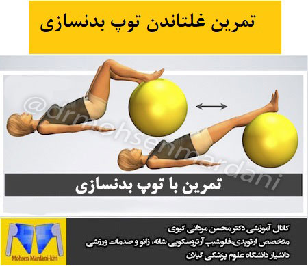 پاهای خود را بر روی یک توپ بدنسازی قرار دهید. با قرار دادن بازوهای خود بر روی زمین (برای کمک به تعادل)، کمر خود را بلند کنید، به طوری که یک خط مستقیم از شانهها تا زانوها تشکیل شود. در این موقعیت بمانید و توپ رادر زیر پاهای خود بغلتانید. در طول ورزش اجازه ندهید بدن شما به سمت پایین شل شود. پاهای خود را کاملاً صاف و کشیده نگه دارید و 8 - 12 بار این تمرین را تکرار کنید .