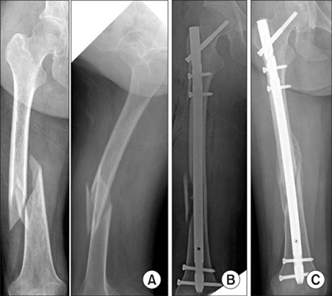 4- درمان شکستگی تنه ی استخوان ران: امروزه تقریبا تمامی شکستگی های ران بالغین با عمل جراحی درمان میشوند. روش کار بدین صورت است که ابتدا شکستگی ران بصورت بسته جااندازی میشود (با استفاده از کشش و مانورهای مخصوصی سعی میشود شکستگی بصورت بسته جااندازی شود. این جااندازی در اطاق عمل انجام شده و پزشک جراح مراحل جااندازی را با استفاده از رادیوگرافی بخصوصی که تصاویر آن مستقیما بر روی مانیتور قابل دیدن است - فلوروسکوپی- کنترل میکند). سپس از راه شکاف های کوچکی که در پوست داده میشود میله داخل استخوانی یا پلاک یا اکسترنال فیکساتور به استخوان متصل شده و آنرا فیکس میکند. به این روش جااندازی بسته و فیکساسیون داخلی یا خارجی میگویند. در صورتیکه جااندازی بسته امکانپذیر نشود پزشک جراح از جااندازی باز استفاده کرده و سپس با روش های پلاک گذاری یا میله گذاری اینترامدولاری شکستگی را فیکس و بی حرکت میکند.