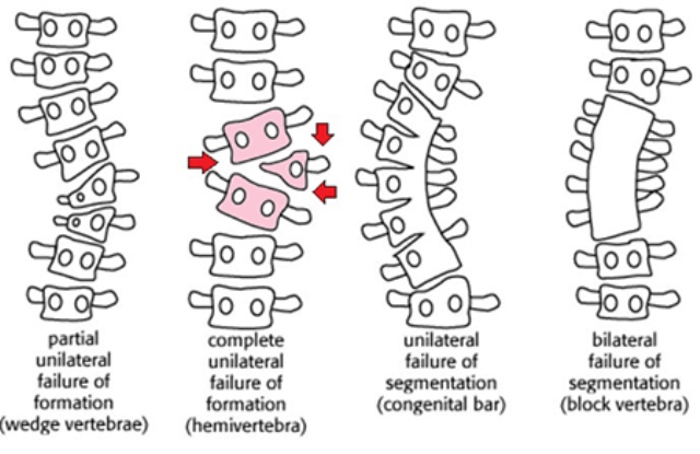 در این نوع, وقتی مهره در زمان جنینی در حال درست شدن است ممکن است قسمتی از یک یا چند مهره درست نشود. مهره درست شده یک نیمه مهره یا Hemivertebrae است. این مهره به جای اینکه به شکل استوانه باشد به شکل یگ گوه است. و در محل همین مهره گوه ای شکل ستون مهره قوس بر میدارد. شدت این قوس با افزایش سن بچه بیشتر میشود . این تغییرات گاهی در یک مهره و گاهی در چند مهره ایجاد میشود. وقتی در چند مهره ایجاد شده و جته مهره های گوه ای شکل در خلاف جهت یکدیگر است ممکت است اثر یکدیگر را خنثی کرده و انحراف جانبی در ستون فقرات ایجاد نشود .