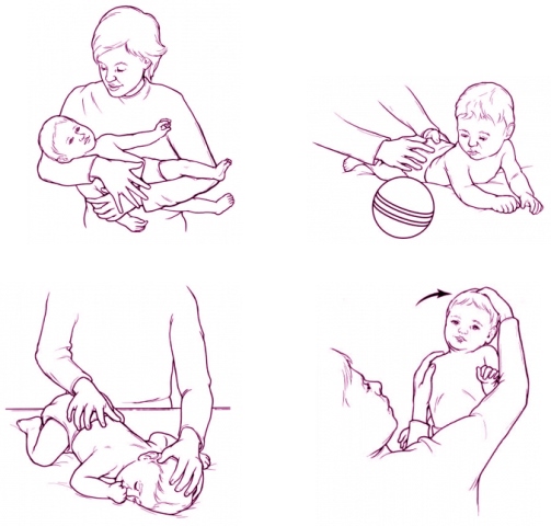 مادر در طول روز باید اسباب بازی های بچه را در سمتی بگذارد که بچه سرش را به طرفی که مشکل دارد بچرخاند. در حین جابجا کردن بچه وی را باید طوری این طرف و آنطرف برد که مجبور شود سرش را به طرفی که مشکل دارد بچرخاند. وقتی بچه را در تخت میگذاریم باید او را رو به دیوار بخوابانیم تا مجبور شود سرش را برای دیدن اطراف به طرفی که مشکل دارد بچرخاند و در موقع شیر دادن هم بچه را در جهتی قرار دهیم که مجبور شود سرش را به طرف دیگر بچرخاند .