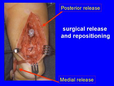 براي اشکالي از بـيماري کـه بـه گـچ گيري مـقاوم بـوده و اصـلاح نشوند و يا پس از اصلاح برگشت نمايند عمل جراحي ضـروري است. اين کار بهتر است در چهار تا شش ماهگي انجام شـود تـا درمان قبل از به راه افتادن کـودک خـاتمه يـافته و کـودک بـتوانـد براحتي با کفش طبي خود راه برود . اعمال جراحي که در سال هاي اول زنـدگي روي ايـن کـودکان انجام مي گيرد عبارتند از: بلند کردن تاندون هاي کوتاه و آزاد کردن کپسول هاي مفصلي و نسـوج جـمع شـده و جـاانـداخـتن مـفصل تالوناويکولر. در سنين بالاتر ا گر تغيير شکل اصلح نشده بـاشد تغييراتي در استخوان ها و مفاصل به وجود مي آيد که با بلند کـردن تــاندون هاي کــوتاه و آزاد کــردن کــپسول هاي مــفصل بـه تنهايي٬ نمي توان تغيير شکل پا را اصلاح نمود و انجام اعمال جراحي بر روي استخوان ها براي اصلح تغيير شکل ها لازم مي باشد .
