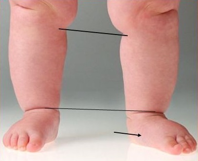 پاشنه اين بيماران در وضعيت طبيعي بـوده و يا در مختصر والگوس قرار دارد (برخـلاف پـاچنبري). مـعاينه مــفاصل ران ايـن کـودکان الزامـي است ٬ چـه وجـود ديسـپلازي مفصل ران در اين بيماران بيش از ديگران است. اين تغيير شکل، در بعضي از بيماران بطور پاسيو قابل اصلاح است . گرچه تغيير شکل در تعداد قابل توجهي از اين کـودکان خـودبه خود اصلاح مي شود ولي با توجه بـه ايـن که تـغيير شکـل در تـعدادي از بيماران باقي مانده و امکان تشخيص اينکه تغيير شکل در کدامـيک از کودکان باقي ميماند وجود ندارد٬ بايد آن را درمان نمود .