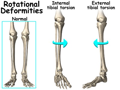 علت تورشن تیبیا Tibial torsion چرخیده بودن استخوان تیبیا یا درشت نی به داخل در زمان جنینی بچه است. چون استخوان درشت نی به سمت داخل چرخیده است مچ و کف پا هم که به آن متصل هستند به سمت داخل کج میشوند و در نتیجه بچه کف پایش را به سمت داخل میگذارد .
