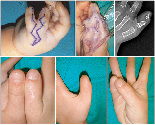 وقتی سه انگشت به هم چسبیده اند معمولا برای جدا کردن آنها نیاز به دو بار عمل جراحی معمولا با فاصله شش ماه از یکدیگر وجود دارد یعنی هر بار فقط دو انگشت از هم جدا میشوند. این اقدام به این جهت انجام میشود که جدا کردن همزمان دو طرف انگشتی که در وسط است ممکن است به عروق و خونرسانی آن صدمه بزند .