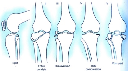 تيپ IV : Rim compression fracture : اين آسيب حدود 12% موارد شكستگي را شامل ميشود. اغلب داراي عدم ثبات است (un stable) . رباط طرفي سمت مقابل و اغلب(75% بيماران) رباطهاي صليبي هم پاره هستند. موارد داراي ثبات (Stable) با گچ درمان ميشوند و در بيشتر موارد هم نياز به جراحي پيدا ميشود كه همراه با ترميم رباطهاي پاره خواهد بود.