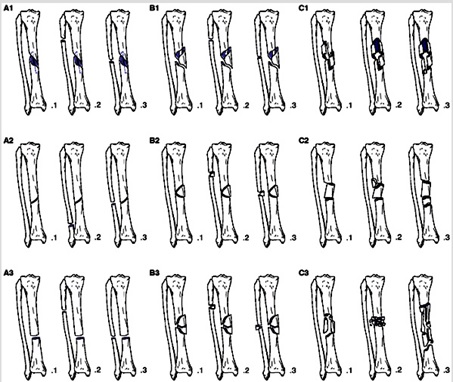 بر اساس اين تقسيمبندي شكستگيهاي ساق به سه گروه كلي B-A و C تقسيمميشوند.