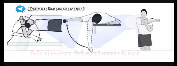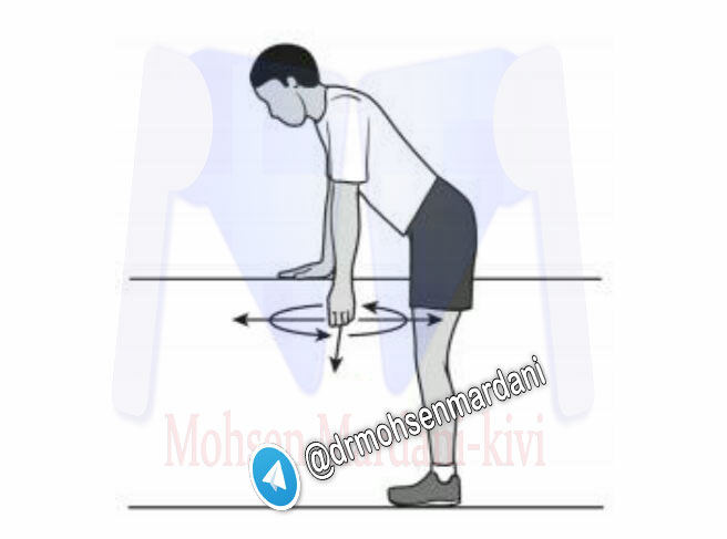 یک دست را روی میز تکیه داده و دست آسیب دیده را به سمت زمین نگه داشته و از مفصل شانه به آرامی دست را دایره وار حرکت دهید (مطابق تصویر)