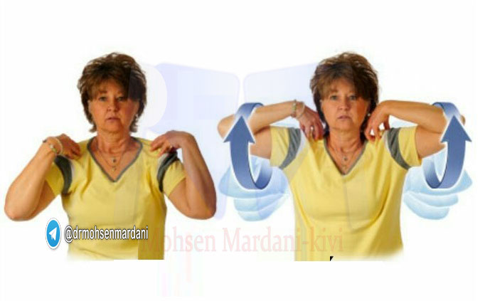 دست ها بر روی شانه ها قرار گرفته و به شکل دایره وار مفصل شانه را حرکت دهید