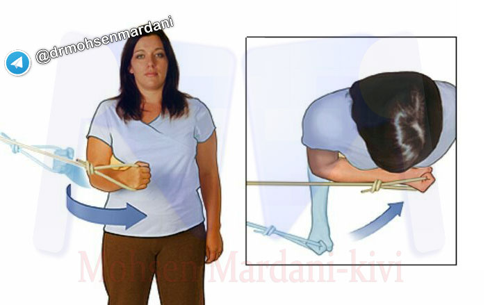 یک لاستیک و یا کش را به دستگیره در نصب کرده و دست آسیب دیده را داخل کش قرار داده و به سمت بدن بکشید (مطابق تصویر)