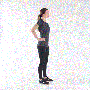 ۲ - زانوهای خود را خم کنید و ران ها و باسن خود را به عقب بکشید طوری که گویا می خواهید روی صندلی بنشینید. چانه خود را داخل بکشید و گردن نیز حالت طبیعی خود را داشته باشد .