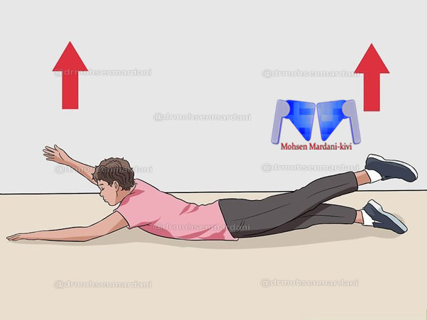 روی شکم دراز بکشید دست ها رو به سمت عقب بکشید سر و شانه را بالا بگیرید وپاها را صاف روی زمین در راستای بدنتان قرار دهید.
