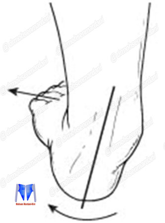 تیلت پاشنه پا به سمت خارج، همچنین به نظر میرسد مچ پا به داخل چرخیده است.